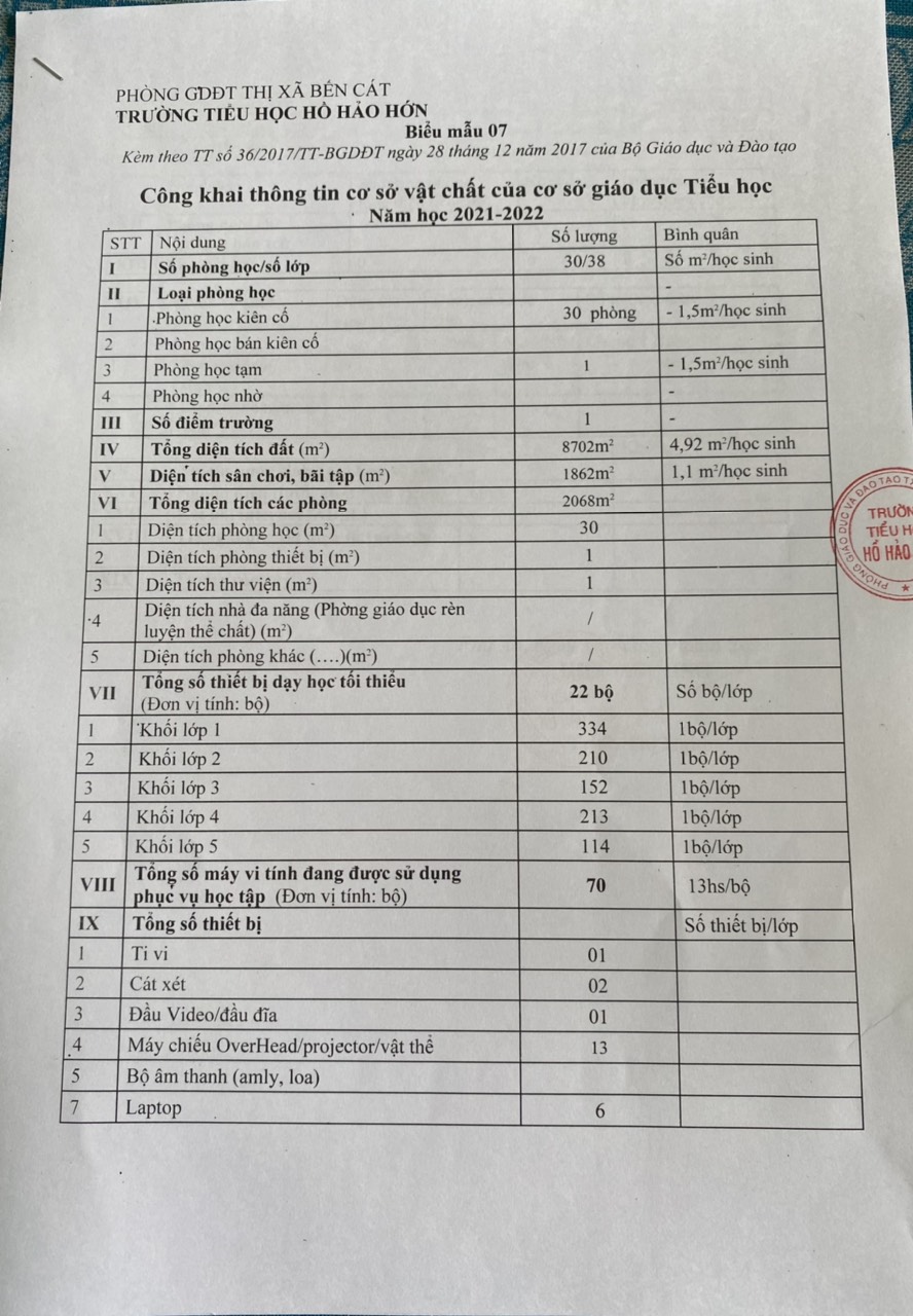 CÔNG KHAI THÔNG TIN CƠ SỞ VẬT CHẤT CỦA CƠ SỞ GIÁO DỤC TIỂU HỌC NĂM HỌC 2021 - 2022