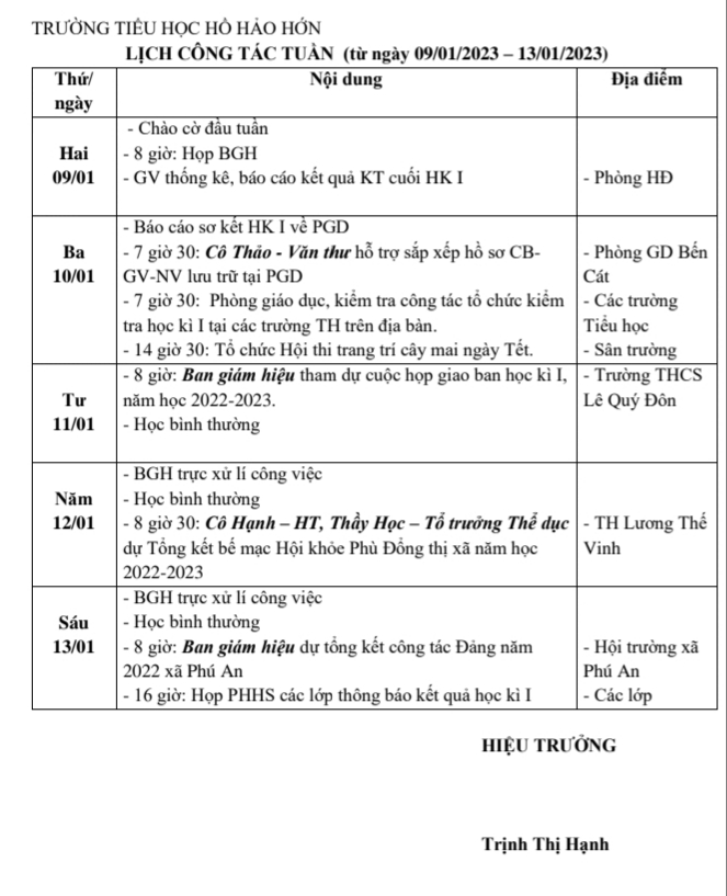 Lich công tác từ ngày 09/01 - 13/01/2023