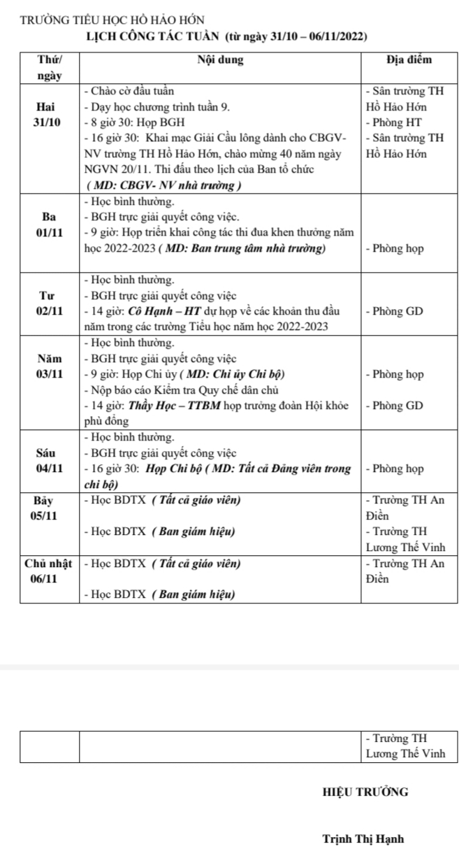 Lich Công Tác Từ Ngày 31/10 - 06/11/2022
