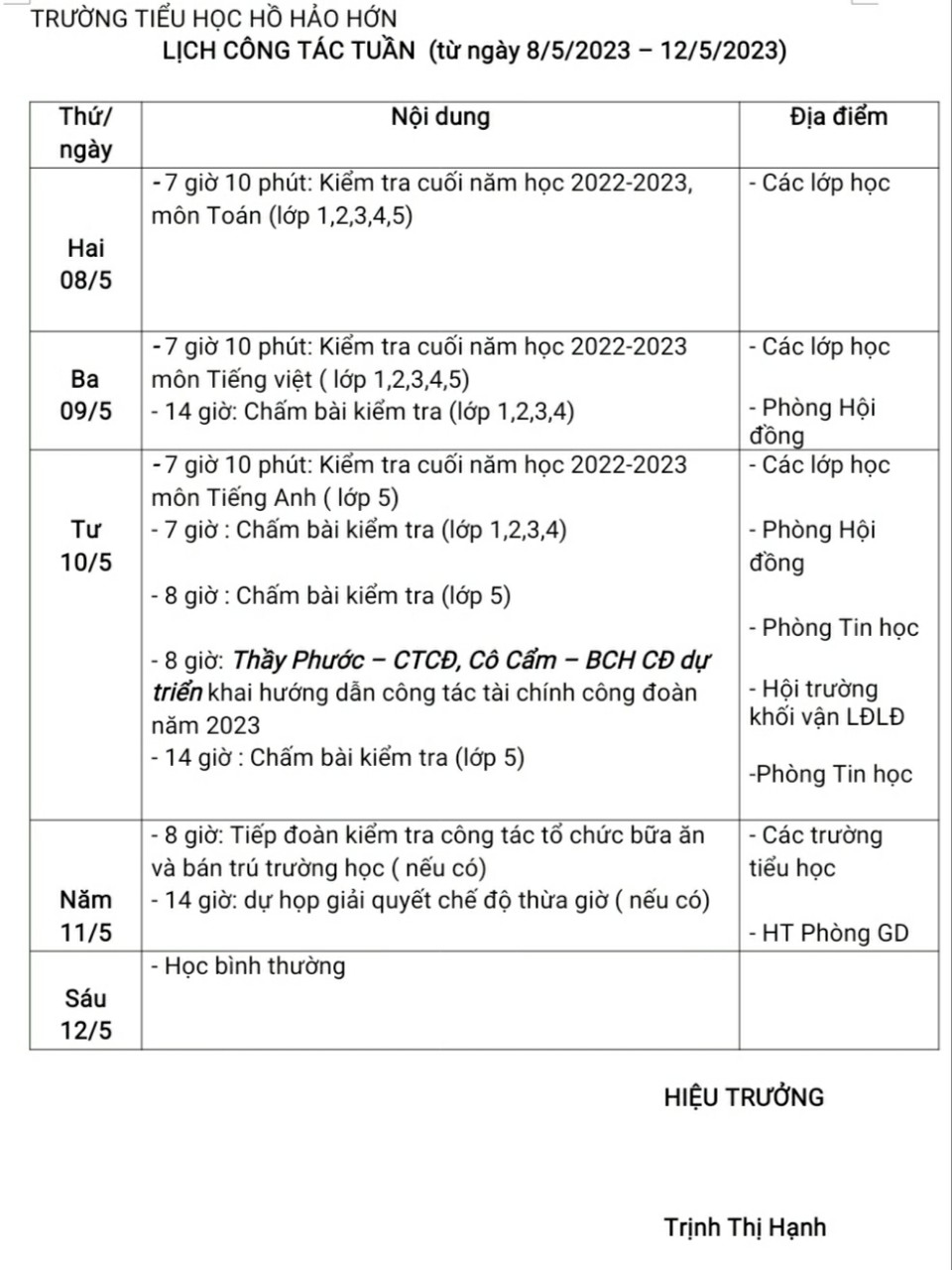 Lịch Công Tác Tuần từ ngày 08/05 - 12/05/2023