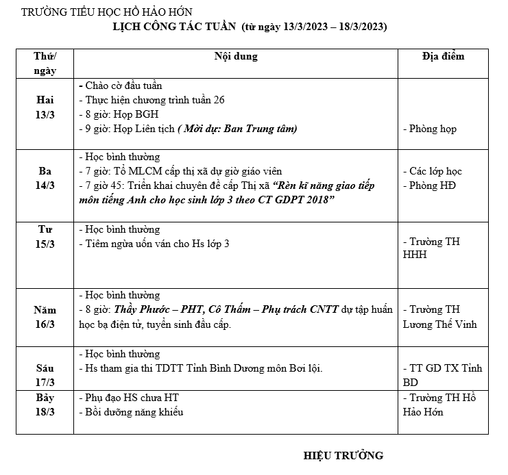 LỊCH CÔNG TÁC TUẦN (từ ngày 13/3/2023 – 18/3/2023)