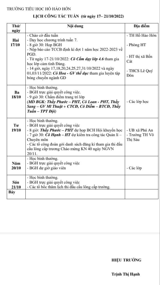LỊCH CÔNG TÁC TUẦN TỪ NGÀY  17 ĐẾN NGÀY 21 THÁNG 10 NĂM 2022