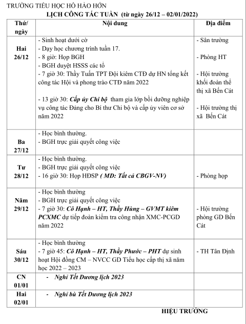 Lịch Công Tác Tuần Từ Ngày 26/12 - 02//01/2023